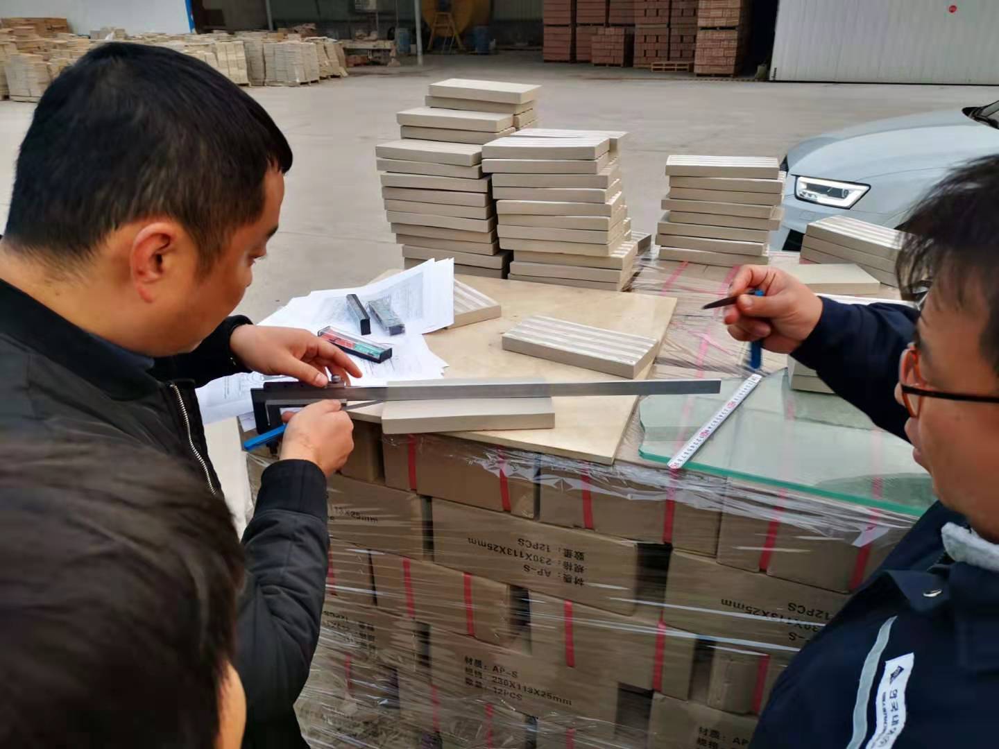 眾光耐酸磚廠家范總親臨耐酸磚檢測現場親自檢測剛生產出來的耐酸磚韓國客戶十分滿意